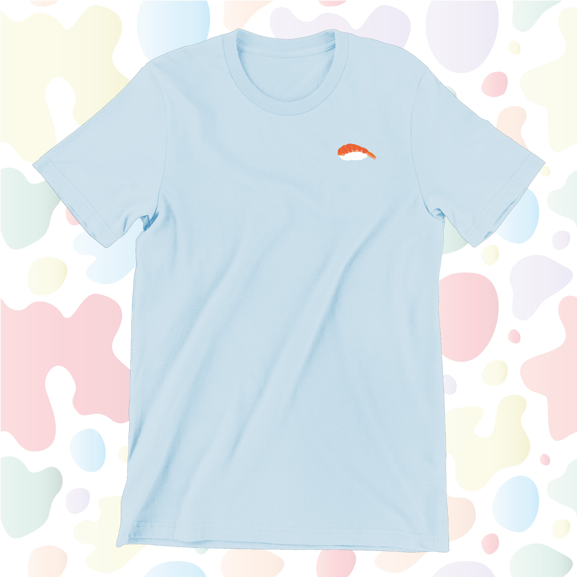 Delicious shrimp sushi embroidered onto our ultra soft, 100% organic cotton and PETA approved short-sleeve t-shirt. Unisex. Inclusive sizing range. Several colours to choose from.
